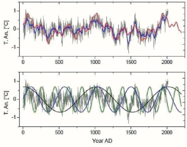 Unten: Verlauf der drei markantesten Klimazyklen in den letzten 2000 Jahren.