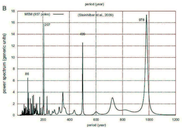 Durch Fourier-Transformation ermittelte Zyklen des Klimaverlaufs: Eddy-Zyklus: 1033 Jahre, Babich-Zyklus 463 Jahre, De Vries-Zyklus 190 Jahre.
