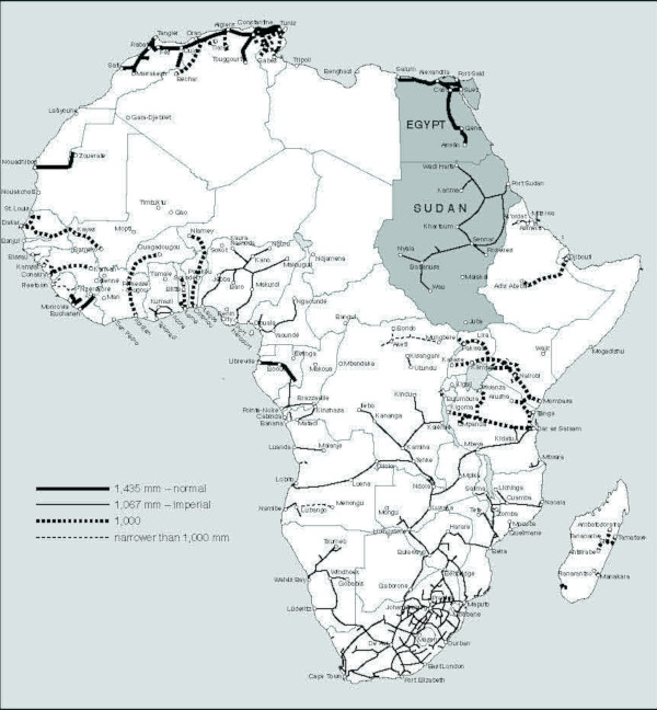Abb. 5: Bestehendes Eisenbahnnetz in Afrika um 1990.
