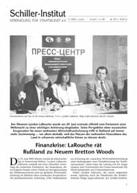 Am 17. August 2002 sprach Lyndon LaRouche vor dem Institut für Sino-Strategische Studien im kalifornischen Whittier. Wir geben hier einen Ausschnitt aus seiner Rede wieder, in denen er seine Vorschläge für ein neues Finanzsystem in knapper Form erläutert.Es gibt eine Lösung für diese Krise!Die gegenwärtig explodierende Währungs-/Finanz- und Wirtschaftskrise ist keine Konjunkturkrise, sondern eine Systemkrise. Das gegenwärtige System selbst hat sie über einen Zeitraum von etwa 35 Jahren hervorgerufen. Es gibt keine Lösung dieser Krise, ohne dieses System zu ersetzen. Auf ähnliche Weise sind in der Vergangenheit Imperien und Dynastien gestürzt, ja sogar ganze Zivilisationen verschwunden. Weiterlesen...Der Ökonom Lyndon LaRouche wurde am 29. Juni 2001 erstmals offiziell vom Parlament einer Weltmacht zu einer wichtigen Anhörung eingeladen. Seine Perspektive einer eurasischen Kooperation für einen weltweiten Wirtschaftsaufschwung trifft in Rußland auf immer mehr Zustimmung -- vor allem deshalb, weil das Platzen der weltweiten Finanzblase das Land in schwerste wirtschaftliche Krisen zu stürzen droht. Laden Sie sich folgende 12seitige Broschüre über die Diskussionen in der Duma herunter: