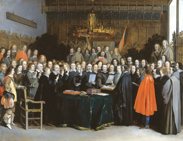 Unterzeichnung des Spanisch-Niederländischen Vertrags in Münster am 15. Mai 1648. In dem Gemälde von Gerard ter Borch wird die feierliche Beschwörung des Westfälischen Friedens im Rathaussaal von Münster festgehalten.