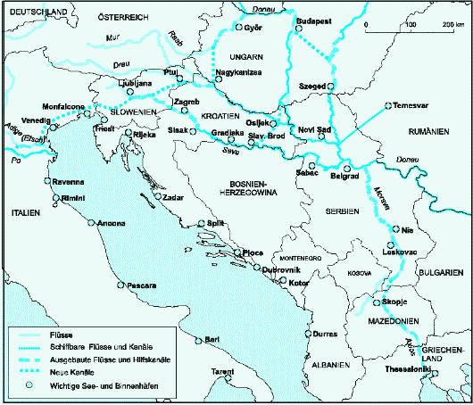 Plan eines Wasserstraßennetzes auf dem Balkan.